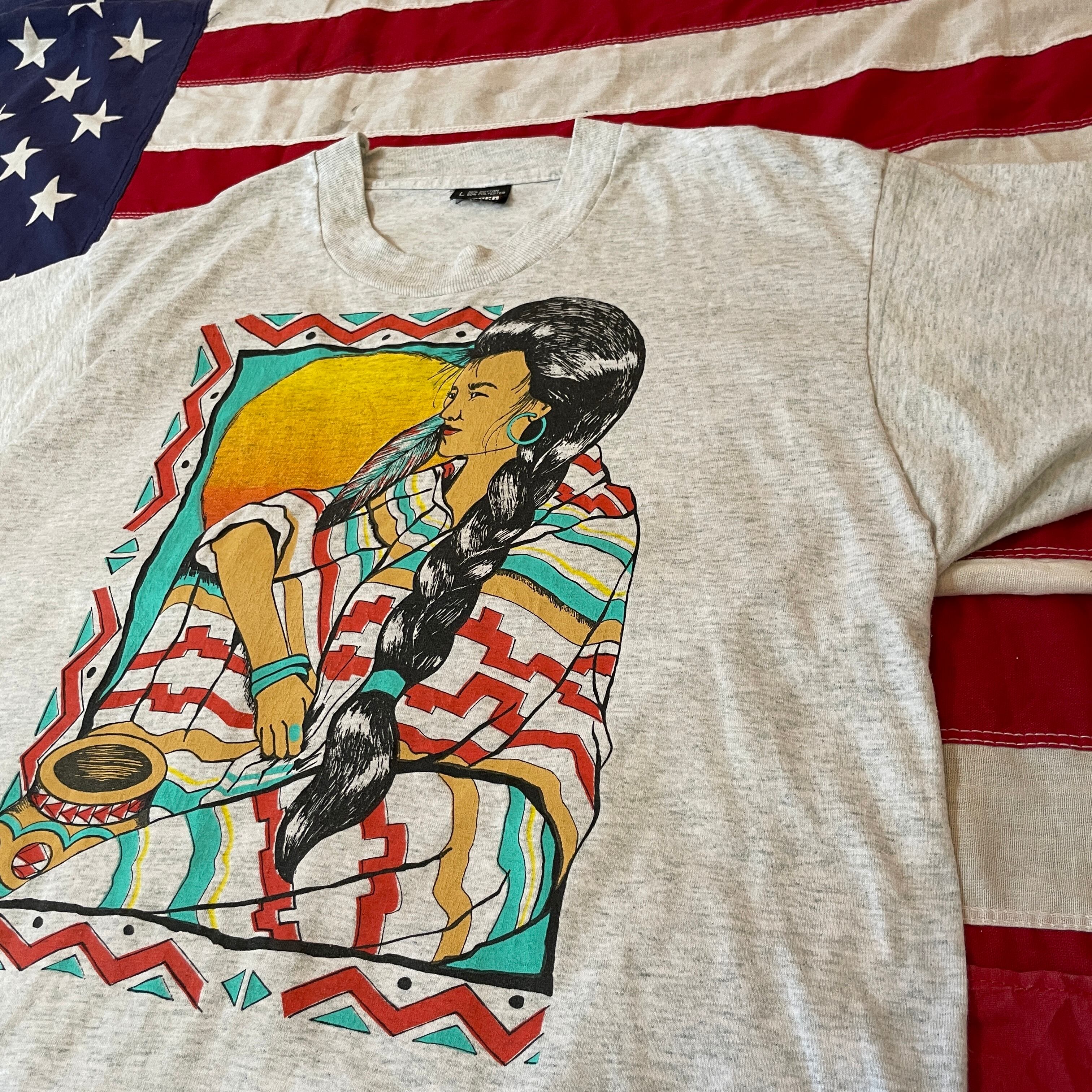 ●1990年代のアメリカ製のネイティブアメリカンなデザインの人物プリントTシャツ