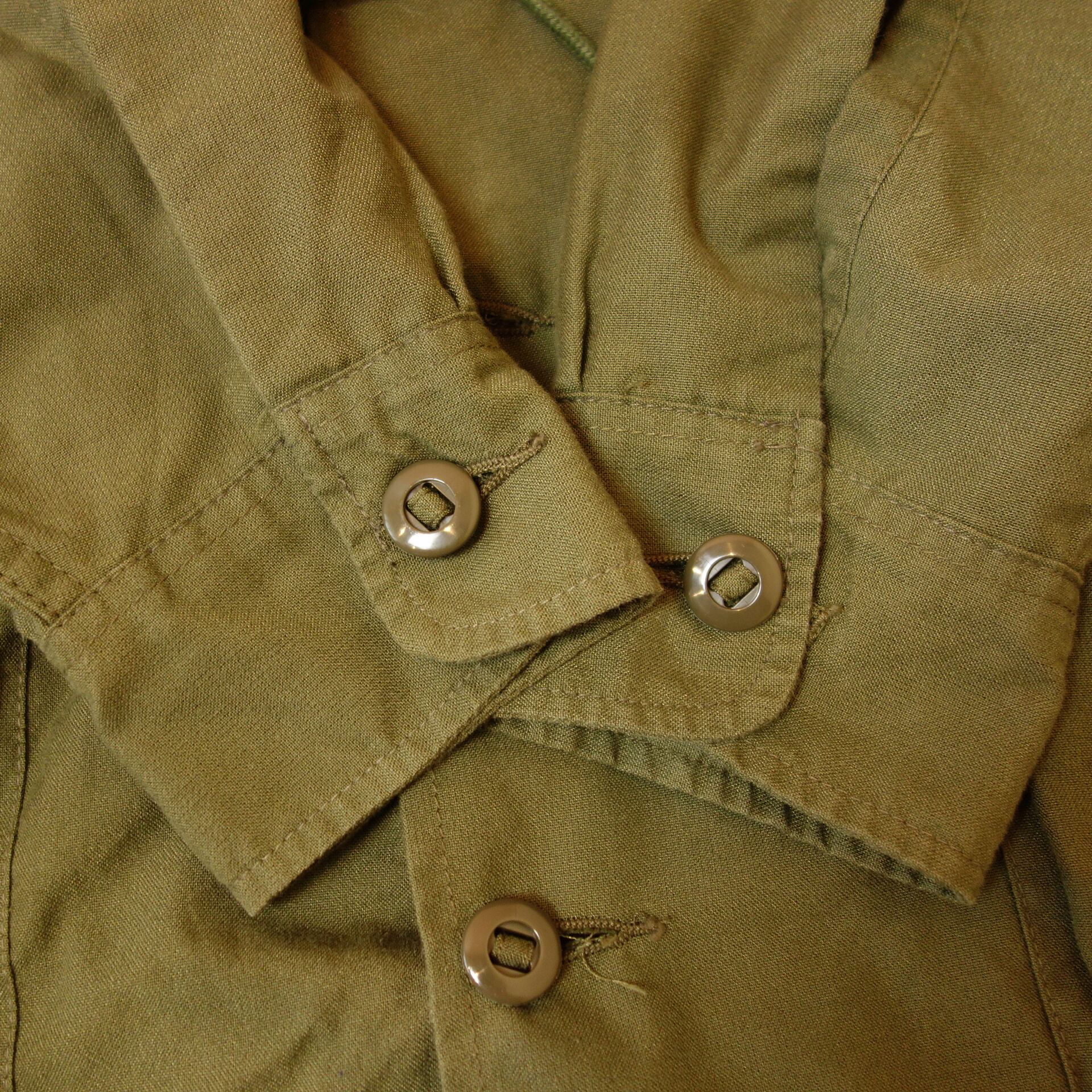 ●斜めについた胸ポケットと、カナダ軍に多く見られるパラシュートボタンが特徴的。チンストラップも付いています。またウエストと裾にはドローコードがあるので、シルエットに変化を付けられます。