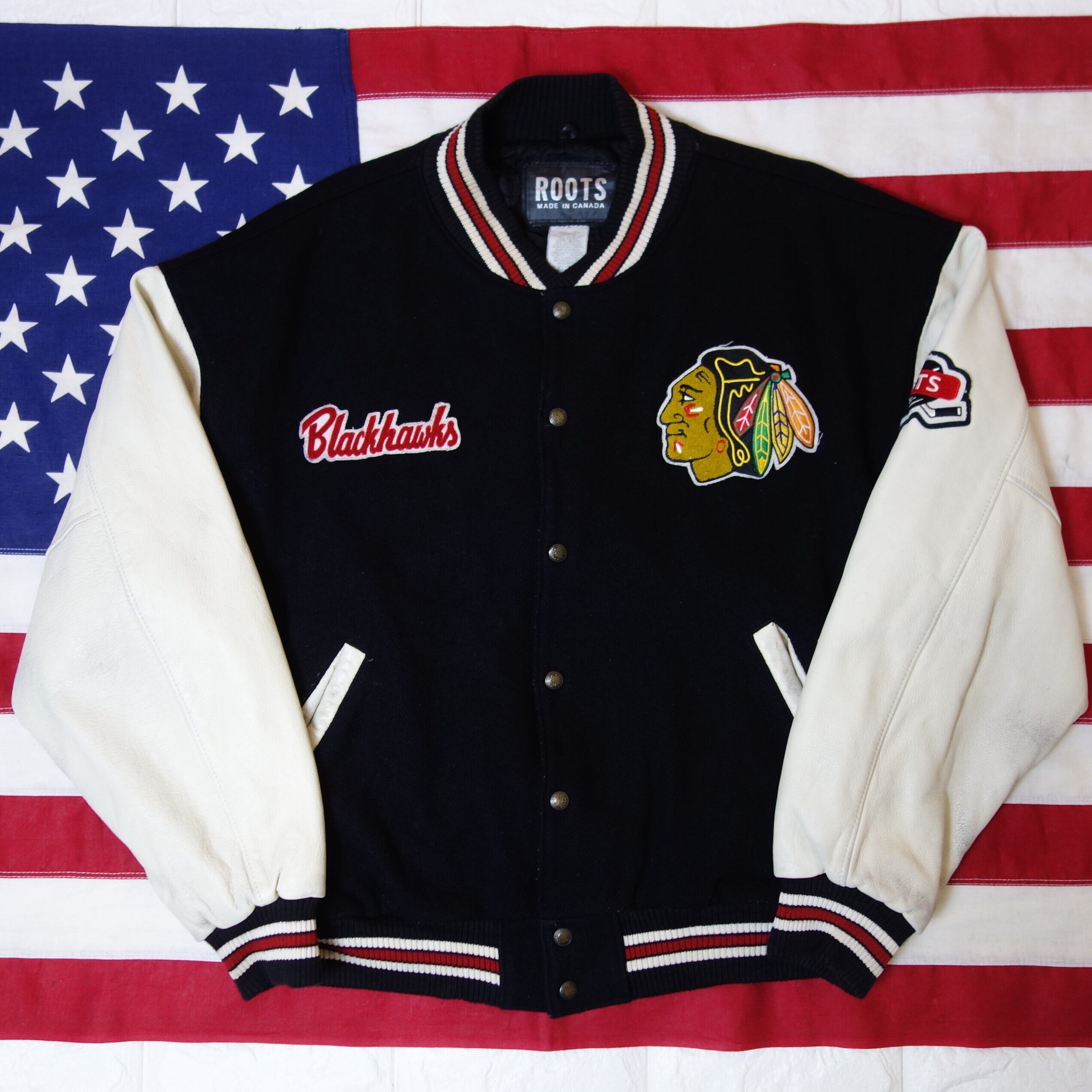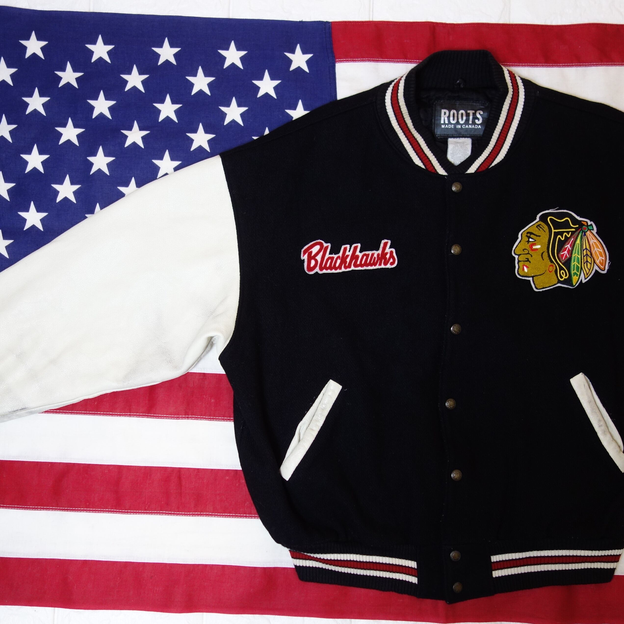 90's 【CANADA製】 ROOTS NHL Chicago Blackhawks Wool Leather Stadium Jacket シカゴ・ブラックホークス スタジャン