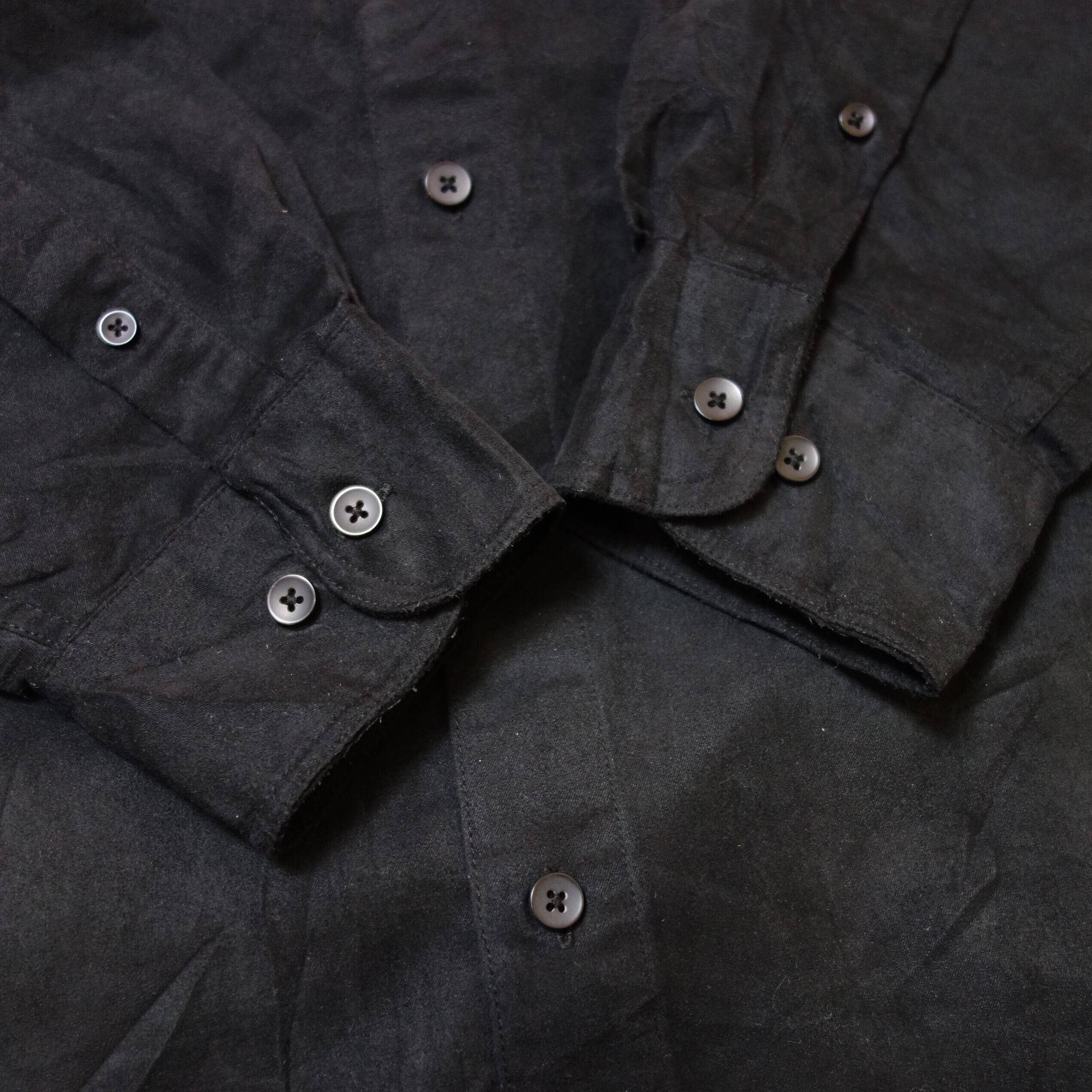 ●ソフトスエードのブラックシャツ。柔らかい肌触りの滑らかな生地感にシンプルな光沢感のあるブラックカラーが最高にGood