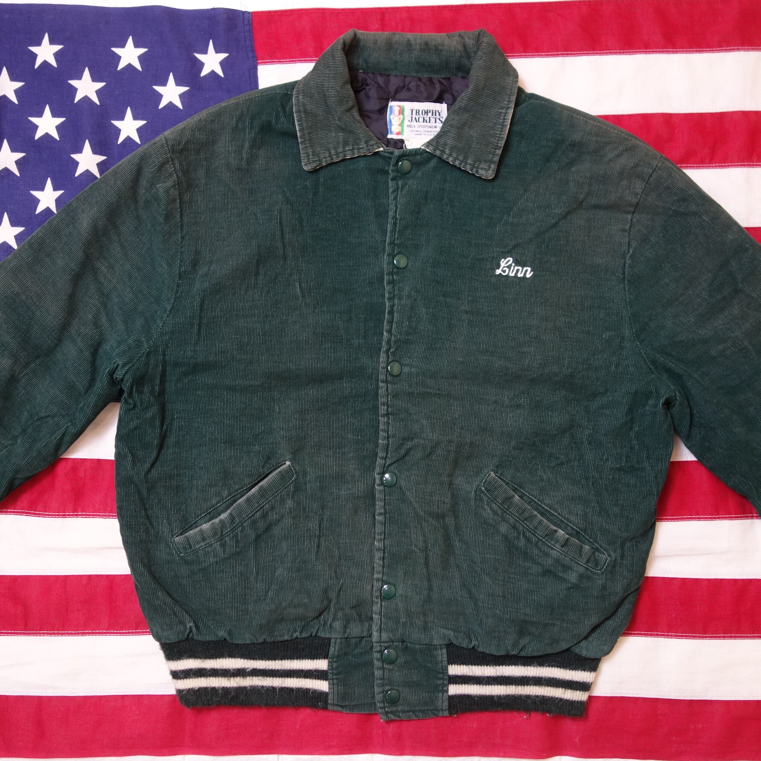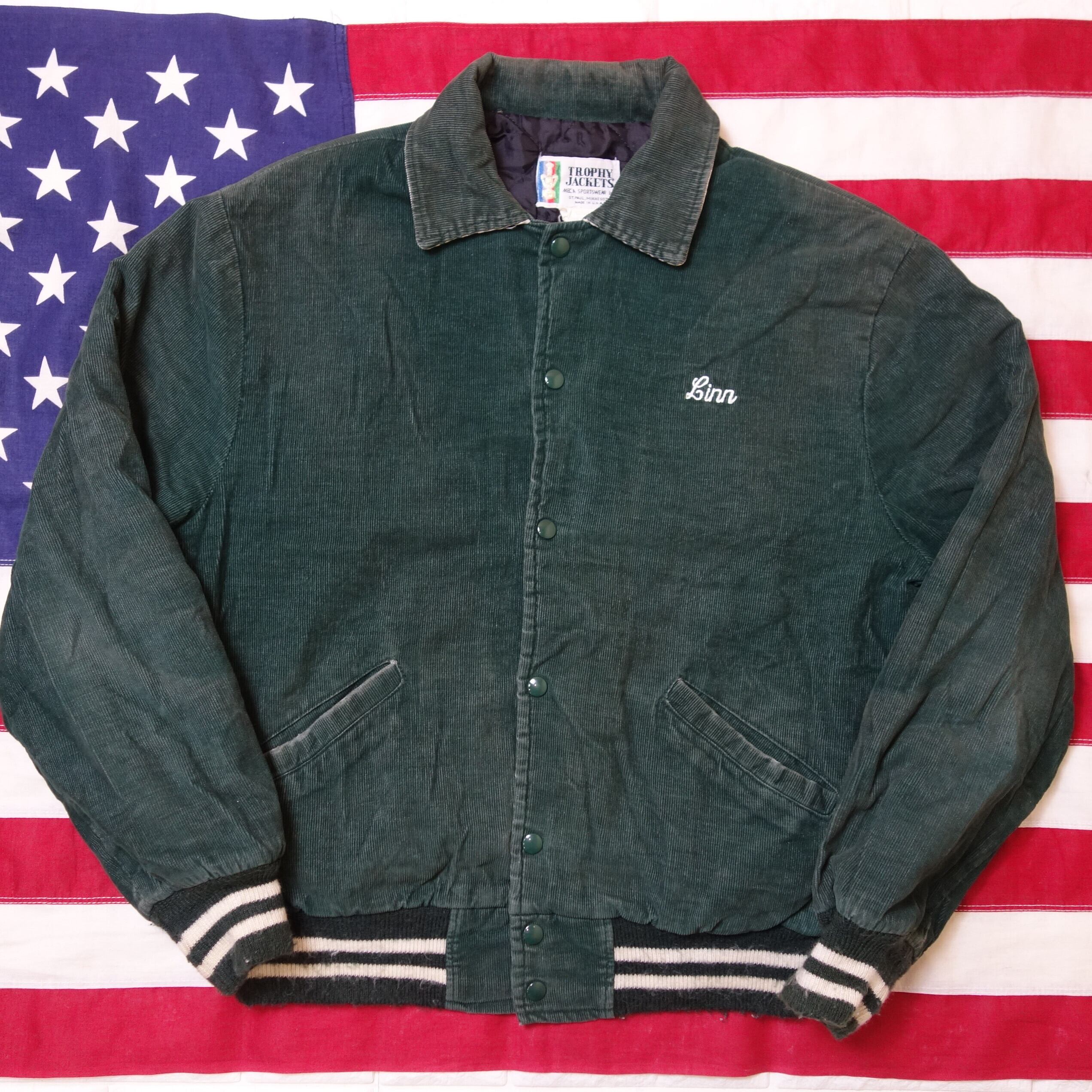 80's 【USA製】 Green Corduro Stadium Jacket グリーン コーデュロイ スタジャン ファイアーマン刺繡