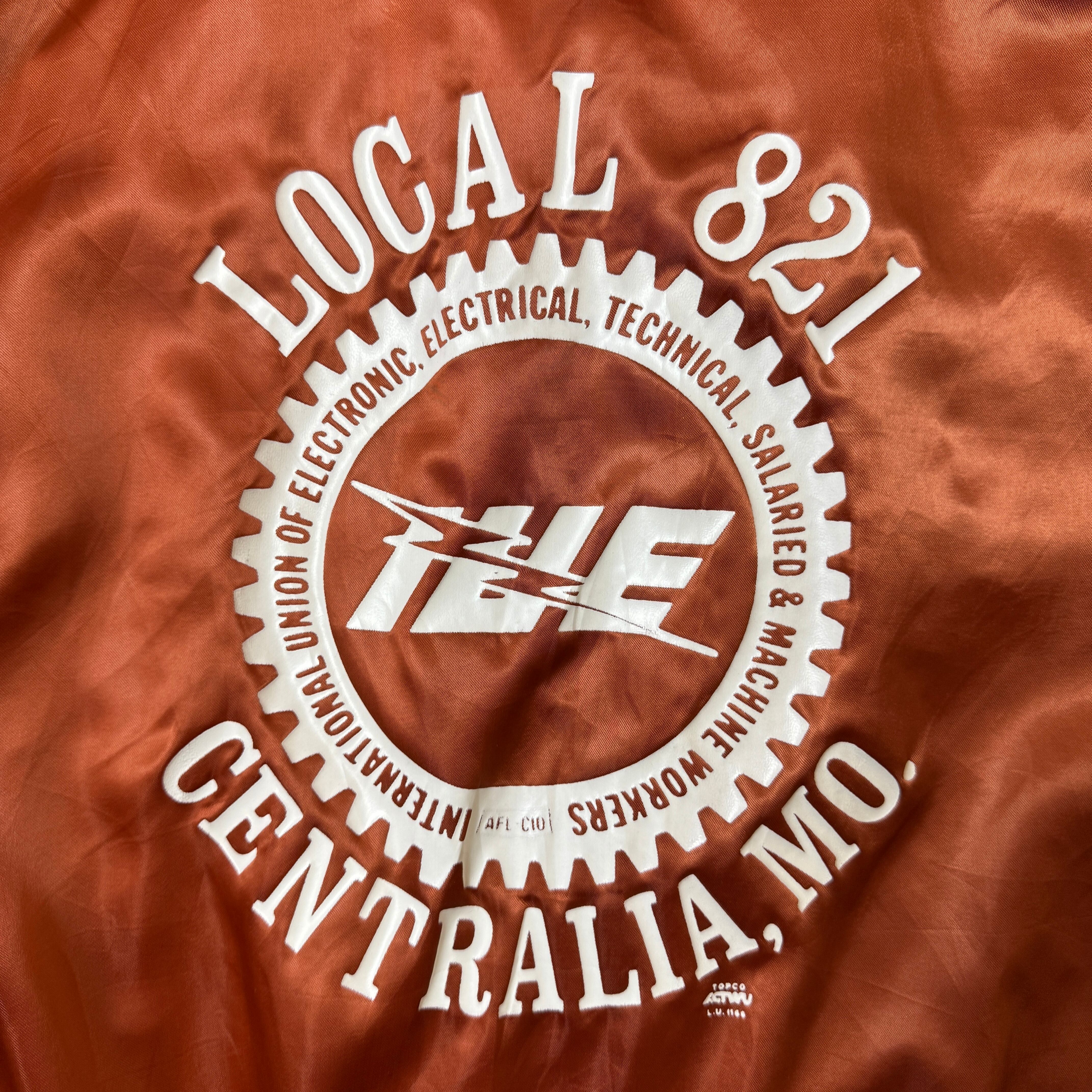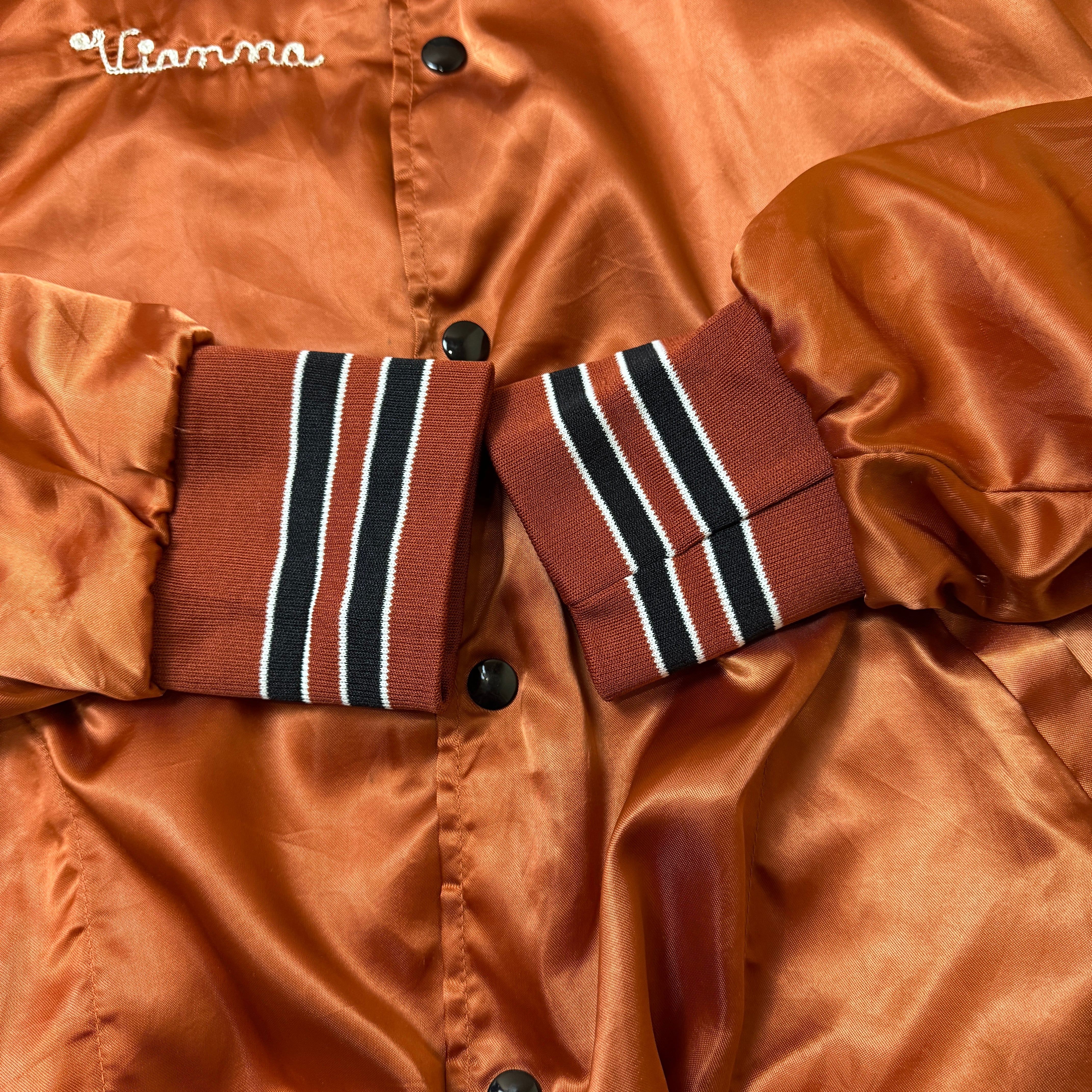 ●仄暗いオレンジカラーの色味が良く、シルエットも短丈ボックスシルエットの映えるスタジャン、コーチジャケット